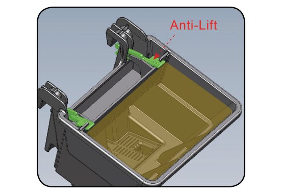 Anti-Lift arms prevent inadvertent dislodgement of trays.